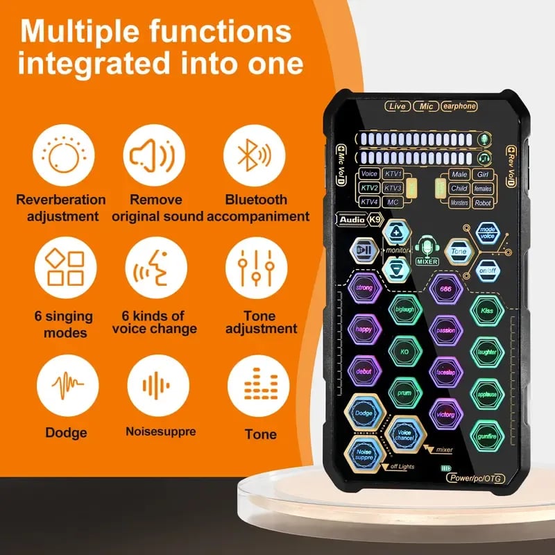 👉 With the SK9 Voice Changer Sound Card, transform: